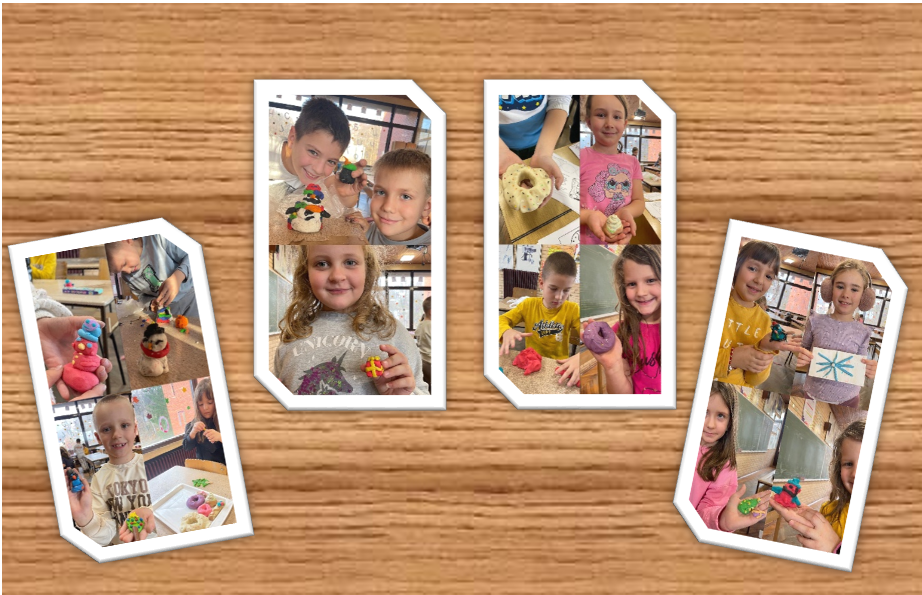 Ученици првог разреда продуженог боравка, са својом учитељицом Аном, играли су се домаћим пластелином који су сами направили. Месили су, ваљали и обликовали разне новогодишње фигуре, колаче и крофне.