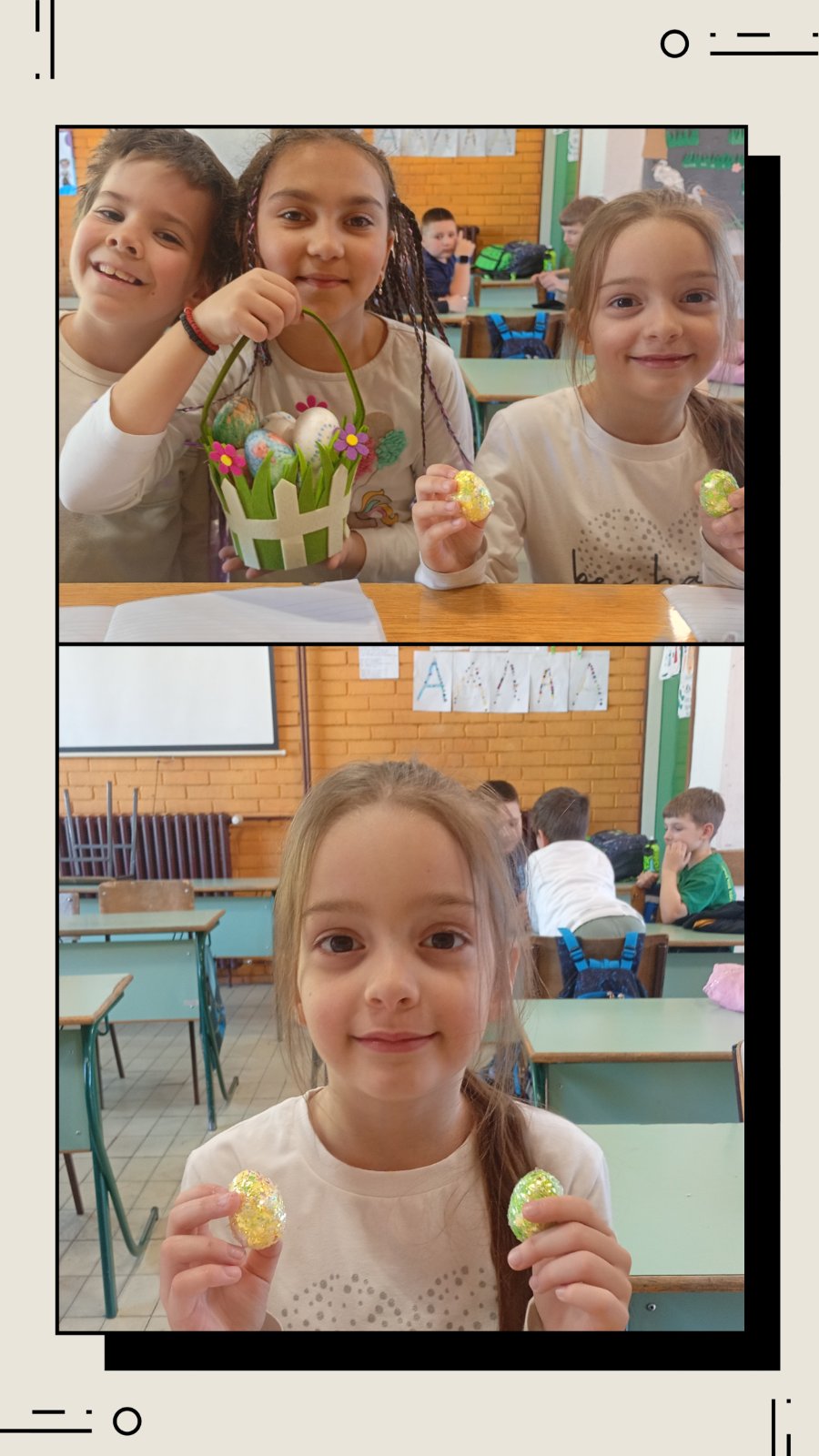Ученици продуженог боравка првог и другог разреда са учитељицом Маријаном Ђоковић су кроз различите активности упознали значај овог великог празника. Са пуно маште и труда ученици су украшавали ускршња јаја, цртали зеке и пилиће и правили разне декорације. Кроз игру развијали су креативност, стрпљење и тимски дух. Посебно су уживали у разговору о симболици и значају Васкрса као и у заједничким играма и смеху који су обележили ове дане. На крају, сви смо се радовали празнику уз жеље за здравље, срећу и љубав.
